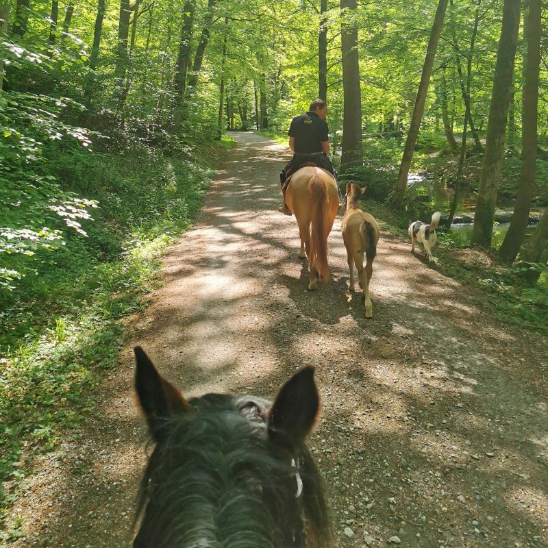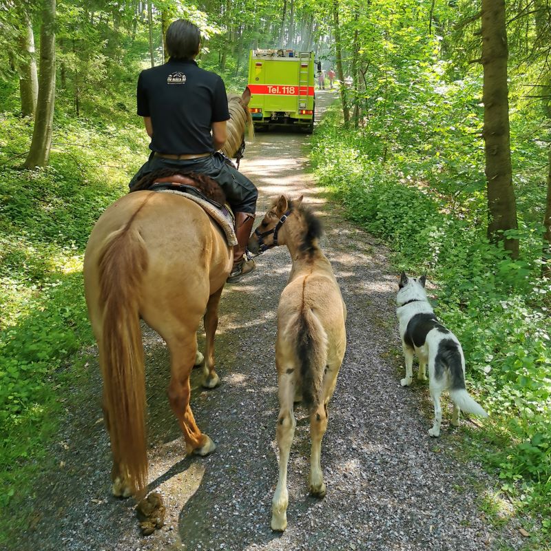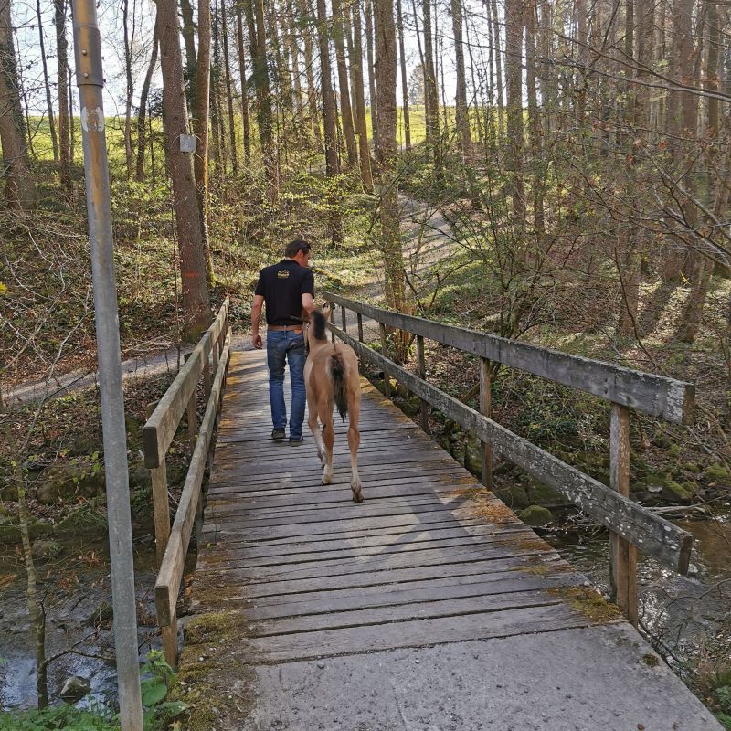 Seit der ersten Begegnung mit ihr zeigt sie sich als ein ausgesprochen freundliches und interessiertes Pferd. Sie ist überaus selbstständig und hat sich schon wenige Stunden nach der Geburt furchtlos von ihrer Mutter Carmera entfernt, denn bereits da wollte sie die Welt erkunden. Früh haben wir angefangen, sie ans Halfter zu gewöhnen und bald schon hat sie uns bei ersten Spaziergängen begleitet. Dabei ist sie immer mutig vor ihrer Mutter vorangegangen. Seit sie etwa zwei Monate alt ist, nehmen wir sie auch als Handpferd auf Ausritten mit. Sie geht über Stock und Stein und fürchtet sich weder vor Spaziergängern, Velofahrern, Traktoren, Baustellen, Autos, Lastwagen noch vor Motorrädern. Sie geht durch Autobahnunterführungen, über Holzbrücken und durchquert Bäche. Wie viel Energie in ihr steckt, wird deutlich, wenn sie wie von der Tarantel gestochen über die Weiden galoppiert. Aber auch im im Schritt kann sie beim Ausreiten schon problemlos mit den ausgewachsenen Pferden mithalten. Nur dass die Kühe nicht zurückwiehern, wenn sie ihnen beim Ausreiten zuruft, das versteht sie nicht.