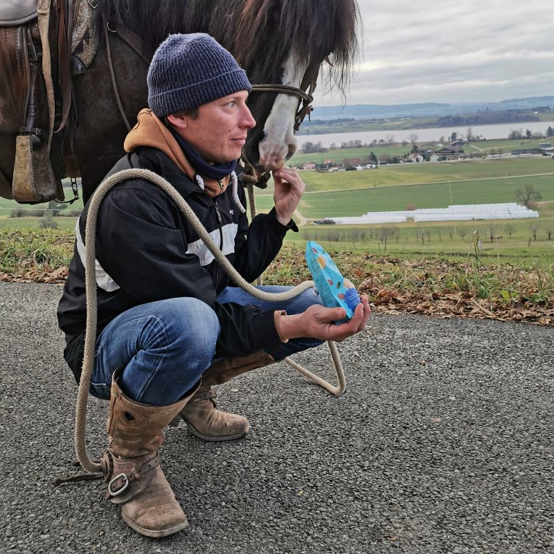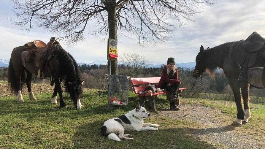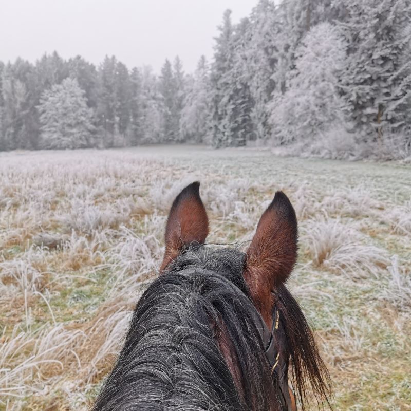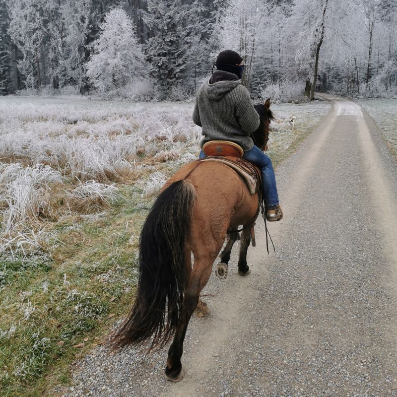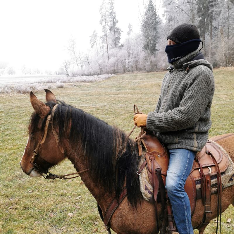 Ende Januar war zu Walters Geburtstag ein Tagesritt geplant, blöd nur, dass wir den kältesten Tag des ganzen Winters erwischt hatten. Geronimo hatte sich zudem in der Nacht ein Eisen runtergetreten. Deshalb ritten wir mit Merceditas und Evita und ganz vielen wärmenden Schichten los. Ziel war das Ausflugsrestaurant Geeren in Gockhausen, wo wir einen Tisch reserviert hatten. Beim Anruf am Tag zuvor waren die Angestellten noch ganz ungläubig, dass wir einen Tisch draussen reservieren wollten, doch als wir kamen, stand der Tisch schon gedeckt bereit und es gab Rösti und Bier im Schneeflockentreiben.