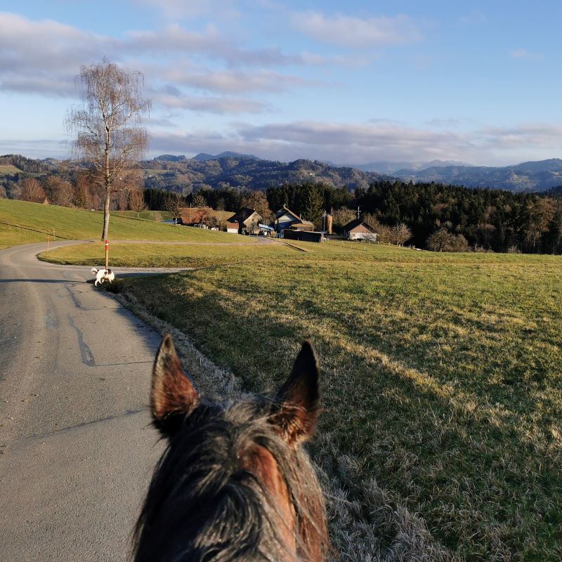 Mitte Januar sind wir von Küsnacht ins Tösstal und zurück geritten. Dabei haben wir in zwei Tagen 91 Kilometern mit 2’480 Höhenmetern zurückgelegt. Vom Stall aus ging es erst um den Greifensee rum, über das Aathal an den Pfäffikersee, diesem entlang und dann durch das Zürcher Oberland bis in die Tösstaler Berge, wo wir bei einem ausgesprochen freundlichen Ehepaar übernachten durften. Evita und Geronimo standen im Stall bei einigen vom Kutschen fahren gut trainierten Haflingern und wir wurden zum Abendessen eingeladen und durften im Haus schlafen. Am nächsten Tag wichen wir ein wenig von der Strecke ab und ritten so an der anderen Seite des Pfäffikersees vorbei und durch die Aussenquartiere von Uster.
