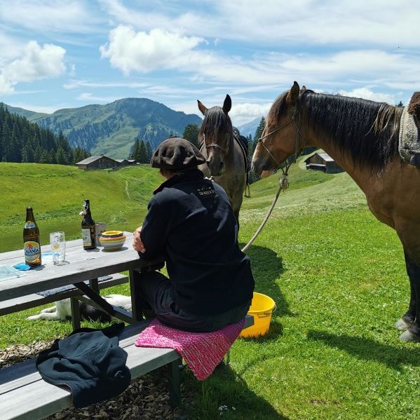 Wie jeder gute Wanderreittag begann auch dieser mit zwei Tassen Kaffee… und damit, dass wir Evita vor dem Satteln morgens um sechs erst einmal waschen mussten, weil sie direkt im Kuhfladen geschlafen hatte. In nur anderthalb Stunden waren wir auf der Alp Stams und hatten einen Aufstieg von über 1’000 Höhenmetern geschafft. Die Pferde zogen in einer bemerkenswerten Geschwindigkeit vom Stall los und den Berg hoch, wohl auch, weil sie noch nicht ahnten, dass es dieses Mal von Stams aus noch weitergehen würde, viel weiter.