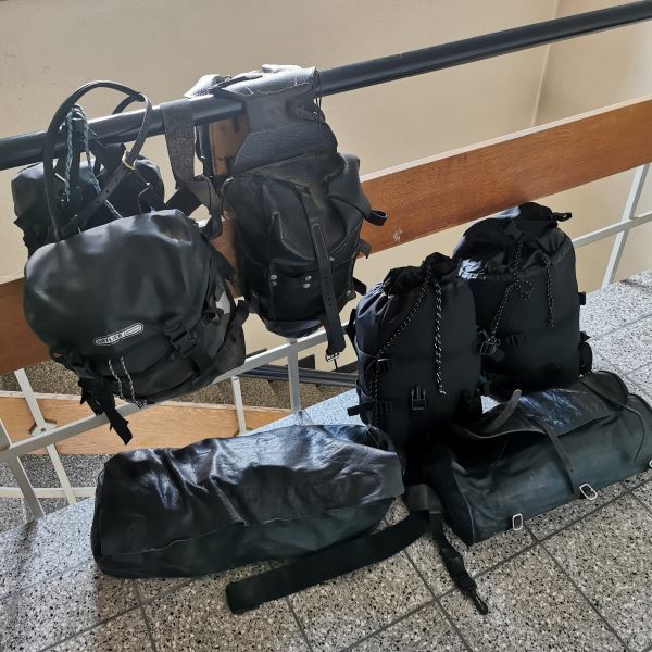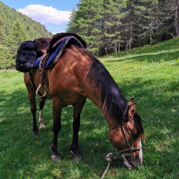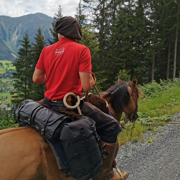 Die Ausrüstung war komplett und im Vorfeld gut erprobt: Für beide Pferde hatten wir Knotenhalfter, die wir unter den Zaumzeugen anliessen. Anja nahm ihren Wanderreitsattel und Walter hatte, wohl als erster Mensch überhaupt, seinen Recado, also den südamerikanischen Gauchosattel, fürs Reiten in den Alpen umgebaut. Beide Pferde trugen hintere Packtaschen und Mantelrollen, an Anjas Sattel waren zusätzlich vordere Packtaschen dran. Rein kamen Isomatten und Schlafsäcke, die allernötigste Wechselkleidung, ein kleines Necessaire, minimales Putzzeug, Trinkflaschen und natürlich ein Deckchen für Tucker!