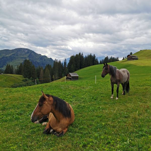An unserem ersten Tag ritten wir von Trimmis erst nach Stams hoch, wo wir zunächst einen Tee brauchten, um uns wieder aufzuwärmen. Es nieselte den ganzen Morgen und es fröstelte uns. Von Stams aus ritten wir über die Alp Zanutsch runter zur Alp Laubenzug. Diese Strecke waren wir vorher schon geritten. Damals standen wir vor einigen Schwierigkeiten, von denen wir hier erzählen. Ein Problem war damals, dass wir auf dem Aufstieg von der Alp Laubenzug auf einen Weg gerieten, der mit Pferd kaum machbar ist. Das eine Mal ging es gut, doch wiederholen wollten wir es nicht. Daher ritten wir dieses Mal über den Chadschlag nach Scära hoch. Ein sehr anstrengender – und wohlgemerkt bereits der zweite – Aufstieg, den die Pferde gut meisterten. Nach dreieinhalb Stunden Reitzeit kamen wir in Scära an, wo wir wahnsinnig herzlich von Corina und ihrer Familie empfangen wurden. Wer immer in der Gegend um Landquart ist, sollte unbedingt in ihrem Berghaus vorbeischauen. Corina, die selber reitet, beherbergt eigentlich keine Leute über Nacht, aber sie war von unserem Ritt so begeistert, dass wir bei ihr und ihrer Familie übernachten durften. Für die Pferde war schon eingezäunt, der Grill bereits angeworfen und wir fühlten uns wie zu Besuch bei Verwandten. Am Abend sassen wir noch lange zusammen, tranken ein Bier, brüteten im Schein der Gaslampe über Karten und überlegten, wo man wohl sonst überall noch hinreiten könnte.
