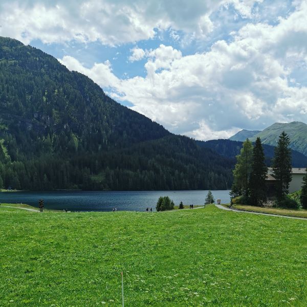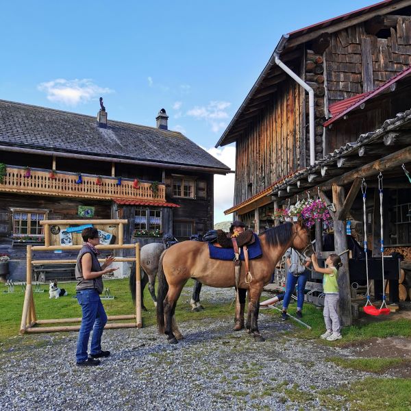 Am dritten Tag hatten wir nur eine kurze Etappe geplant, denn am folgenden Tag würde uns ein sehr anstrengender Streckenabschnitt bevorstehen. Wir ritten von Klosters über den Wolfgang nach Davos. In Davos trafen wir nach zweieinhalb Stunden Reitzeit Anjas Bruder und seine Familie. Sie begrüssten uns schon beim Einritt nach Davos am Strassenrand! Kurz vor dem Stall durften Anjas Neffen dann auch mal für ein paar Meter aufsteigen und schon ein bisschen Wanderreitluft schnuppern.