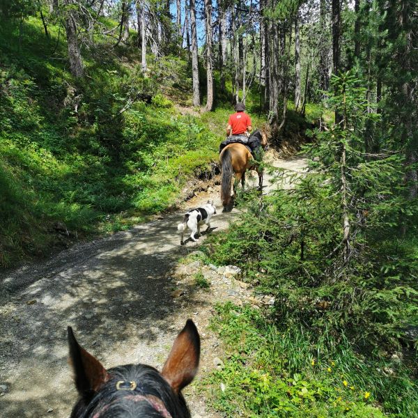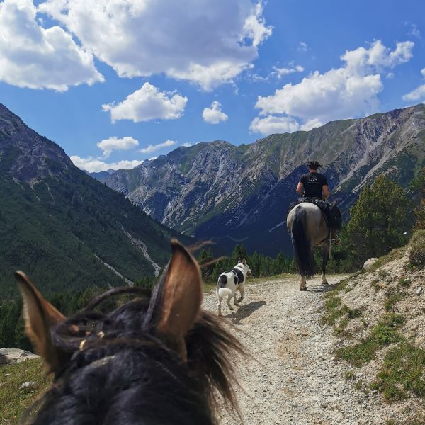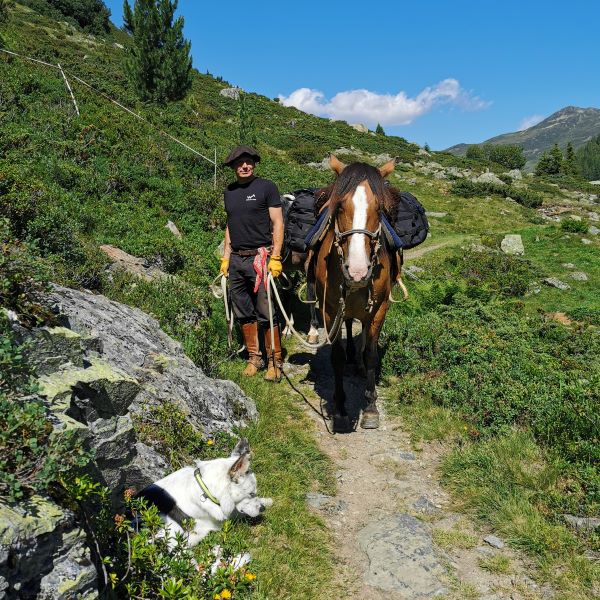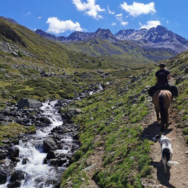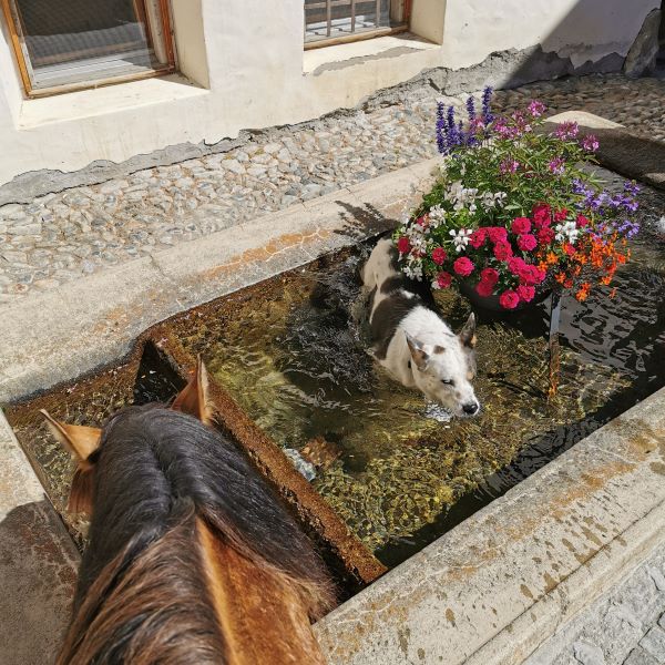 Wir kamen zügig voran. Die Pferde hatten auf dem ganzen Ritt eine Durchschnittsgeschwindigkeit um die 6km/h und das komplett im Schritt. Auf dieser Etappe war es aber wieder sehr heiss und es gab kaum Schatten. Tucker hatte spätestens im Engadin gelernt, nicht nur an jedem Bach oder Brunnen zu trinken, sondern gleich reinzuspringen (was er bis heute beibehalten hat). Die Pferde brauchten ein paar Anläufe, aber sie gewöhnten sich recht schnell daran, dass ein Hund in ihrem Getränk schwimmt. Das ist für uns etwas vom Schönsten am Wanderreiten: Wie wir und unsere Tiere als Gruppe zusammenwachsen.