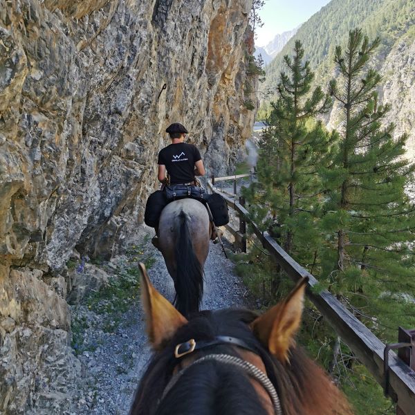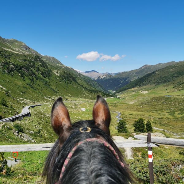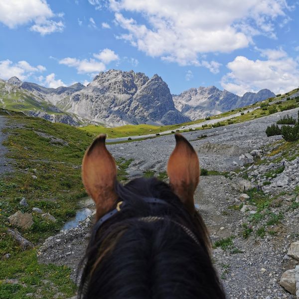 Auf dem Weg auf den Flüela hoch konnten wir wunderschönen Pfaden folgen und wir kamen gut voran. Ursprünglich hatten wir geplant, uns auf dem Flüelapass mit einer Rösti zu belohnen. Da es aber sehr heiss war und wir auf dem Weg runter ins Engadin eine längere Strecke auf der Strasse reiten mussten, entschieden wir uns, nach einer kurzen Pause im Schatten, gleich weiterzureiten.