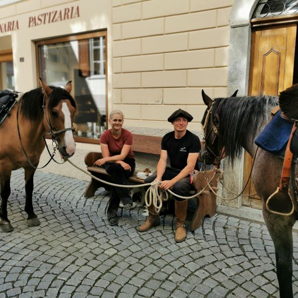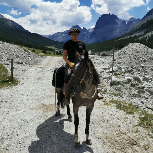 Tatsächlich wurde der Weg ins Engadin sehr anstrengend. Unsere Pferde sind absolut verkehrssicher, doch leider wissen nicht alle Autofahrer, wie man Pferde auf einer Passstrasse überholen soll, so dass wir vom Sattel aus den Verkehr regeln mussten. Zudem brannte die Sonne auf uns nieder, was für alle eine Herausforderung war, doch besonders schwierig für Tucker. Umso erleichterter waren wir, als wir endlich von der Teerstrasse weg und schliesslich in den Wald und an einen Bach kamen. Nach knapp fünfeinhalb Stunden Reitzeit erreichten wir erschöpft Susch im Unterengadin.