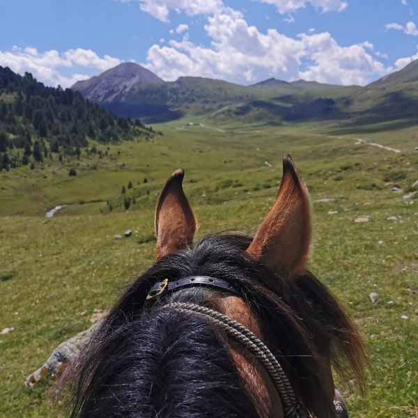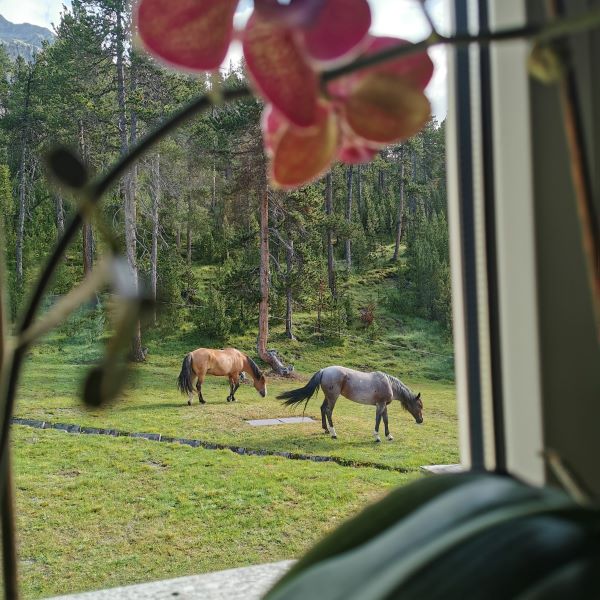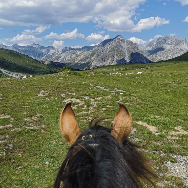 Am nächsten Tag stand die südlichste Tour an, die uns bis an die italienische Grenze heranführte. Von Sta. Maria ritten wir hoch ins Val Mora, ein Ort, an dem jeder Wanderreiter mal gewesen sein muss! Auf der Alp Mora machten wir eine kurze Pause und ritten weiter eine steile Anhöhe hoch auf Juf Plaun, eine wunderschöne Hochebene, und von dort wieder runter nach Buffalora. Auf der Alp Buffalora stiegen wir ab, ganz stolz auf unsere Leistung, stoppten Komoot und merkten erst dann, dass uns noch einige Meter zum Restaurant und Hotel Buffalora fehlten. Also wieder aufsteigen! Nach insgesamt vier Stunden Reitzeit kamen wir dann am richtigen Ort an. Dort durften wir für die Pferde einen Bereich gleich hinter dem Restaurant abzäunen und die beiden bekamen ihre wohlverdiente Pause.