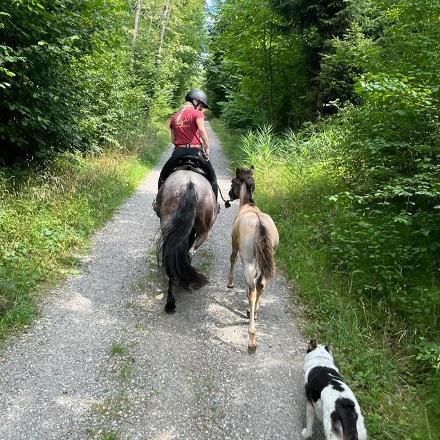 Wie mit all unseren Fohlen haben wir auch sie erst behutsam ans Halfter gewöhnt, dann die ersten Spaziergänge gemacht – wobei Cassiopeia mutig ihrer Mutter im Verkehr, durch den Bach und über Brücken vorausgeht – und haben sie, seit sie zwei Monate alt ist, als Handpferd mitgenommen, so dass sie schon in jungen Jahren möglichst viel von der Welt sieht.